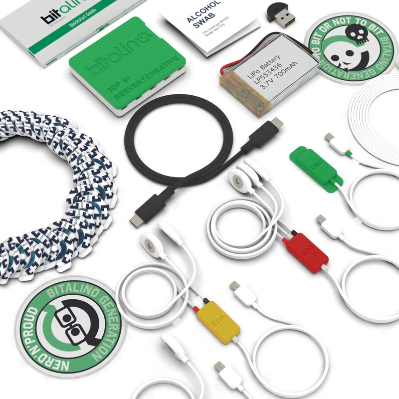 ClassBIT Sciences is a teaching pack designed for Non-Engineering learning fields. This pack is ideal for Sciences-related disciplines such as Physiology, Psychophysiology, NeuroSciences, Biology, Sport Sciences, Healthcare Disciplines, etc. that focused on the biosignals and physiology learning. It includes 10 individual sets fully equipped with different biosensors, including EMG, ECG, EDA, EEG, Respiration and PPG Sensors.